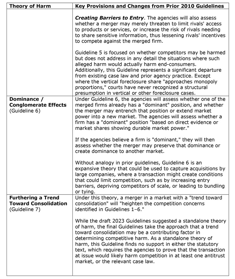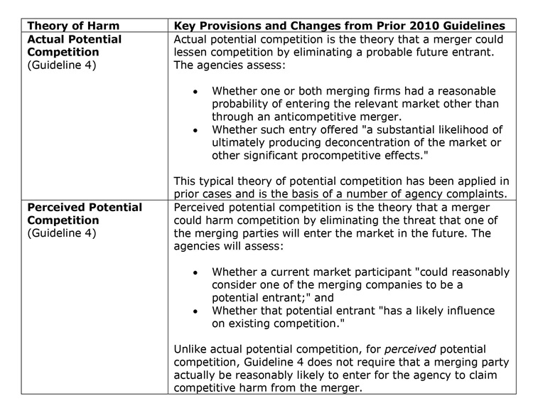 The table below summarizes the theories of harm presented in the final guidelines and the implications of each.