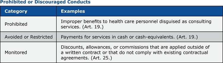 The Guidelines address nine business activities that HCLS companies routinely engage in that have been identified as areas at risk for bribery, namely: (i) academic promotional activities, such as the meetings with HCPs to provide academic information and technical consultations; (ii) hospitality, e.g., meals and entertainment for HCPs during business interactions; (iii) consulting service fees to HCPs; (iv) outsourcing medical research, manufacture, and other business activities to third parties; (v) financial incentives provided at the point of sale, e.g., discounts, rebates, and commissions; (vi) donations, sponsorships, and grants; (vii) free supply of medical devices to HCOs; (viii) clinical research; and (ix) sales through retail pharmacies.