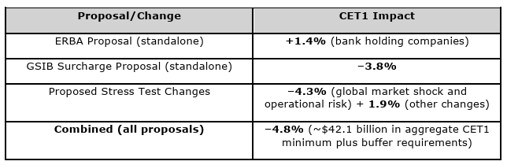 The Development: Together, and in combination with the recently finalized enhanced supplementary leverage ratio ("eSLR") changes and pending stress test modifications, these proposals are expected to reduce aggregate CET1 capital requirements for Category I and II bank holding companies by approximately 4.8%, equivalent to approximately $42.1 billion. But the details of the capital rules mean that there will be significant variation from one bank to another.