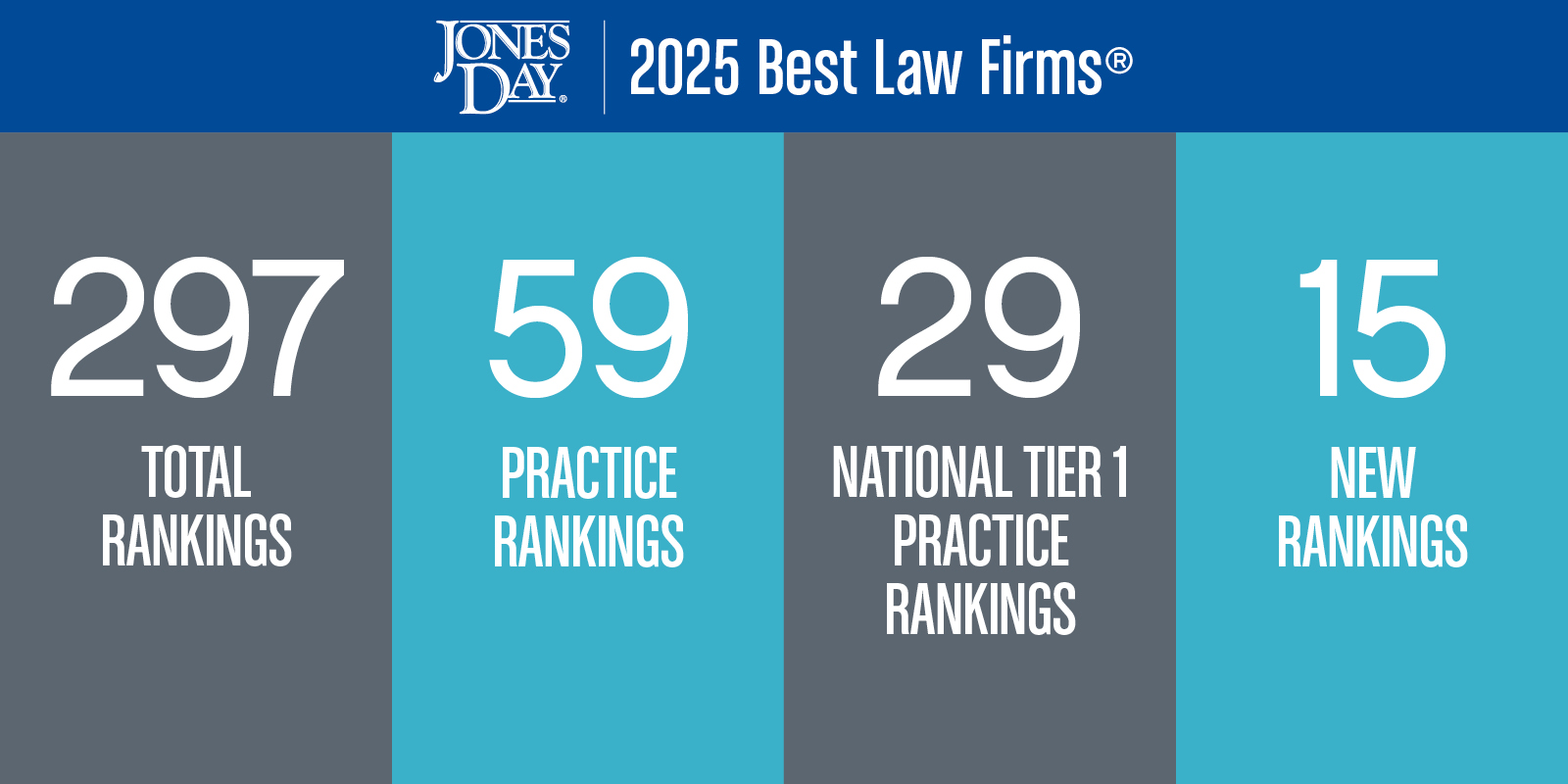 Jones Day is recognized in the 2025 edition of Best Law Firms®, which ranks firms based on peer and industry-driven evaluation, with 297 rankings across multiple tiers and national and metropolitan areas.