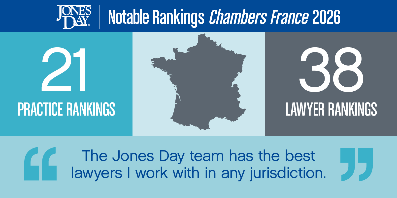 The 2026 edition of Chambers France: The World's Leading Lawyers for Business recognizes Jones Day with 21 practice rankings and 38 lawyer rankings. Highlights from the 2026 edition include: