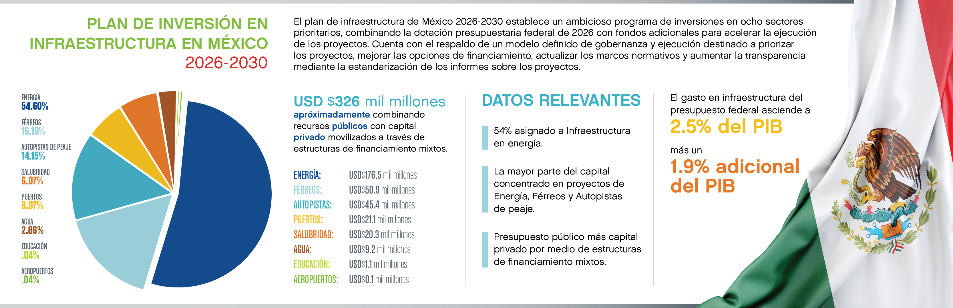 En febrero de 2026, el Gobierno Federal presentó el Plan de Inversión en Infraestructura para el Desarrollo con Bienestar 2026–2030, con una meta de inversión de aproximadamente 314,800 millones de dólares en infraestructura, distribuida entre energía (54%), conectividad terrestre (30%), conectividad marítima y aérea (6.5%) e infraestructura social (9.5%). La Ley proporciona el marco institucional y contractual para instrumentar dicho Plan.