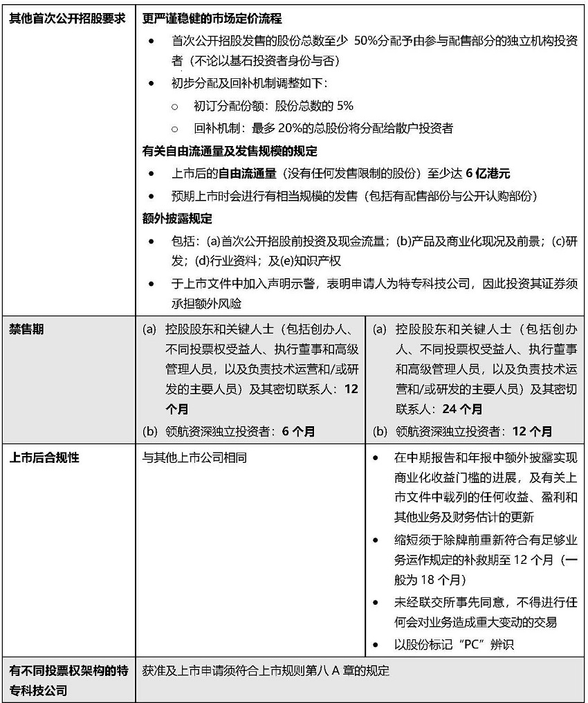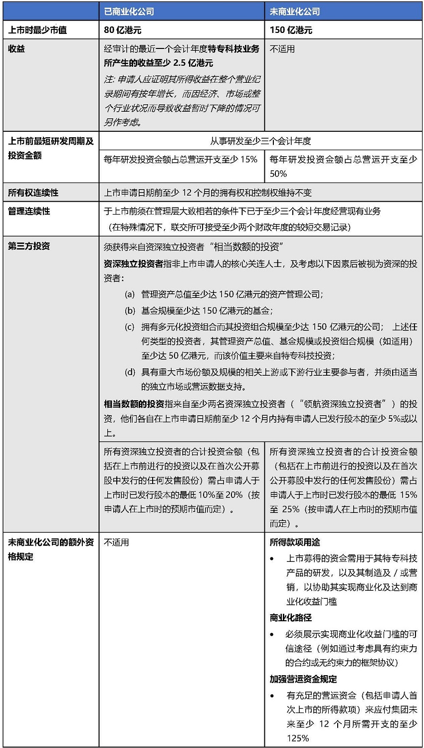 - 新制度下特专科技公司上市申请受有关市值和发售规模、研发参与、资深独立投资者的投资以及市场定价流程的条件限制。